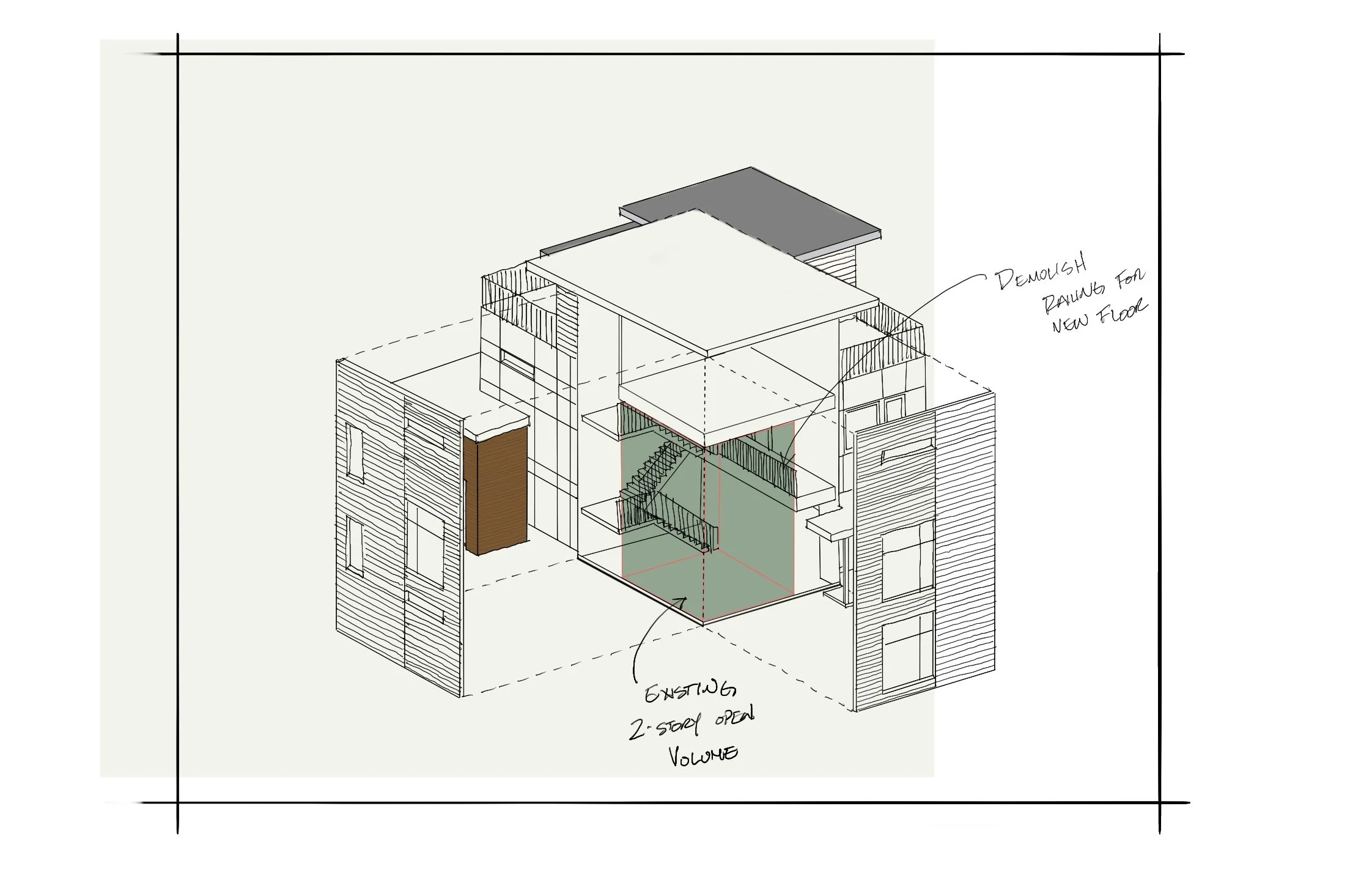 A dramatic transformation occurred in the main living space, where a two-story atrium was enclosed to create more intimate proportions below and add a private office on the second floor.
